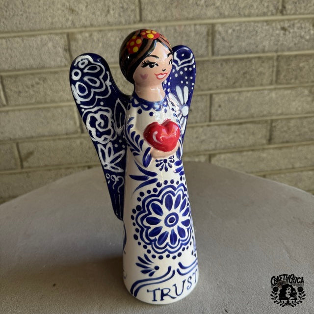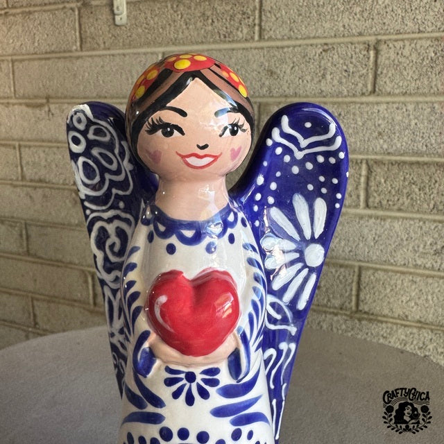 Crafted with intention and care, this fired ceramic angel features intricate floral patterns, a serene smile, and heartwarming details—literally! She holds a vibrant heart in her hands, symbolizing love, protection, and creativity. No two are exactly alike, making each one a one-of-a-kind treasure.
