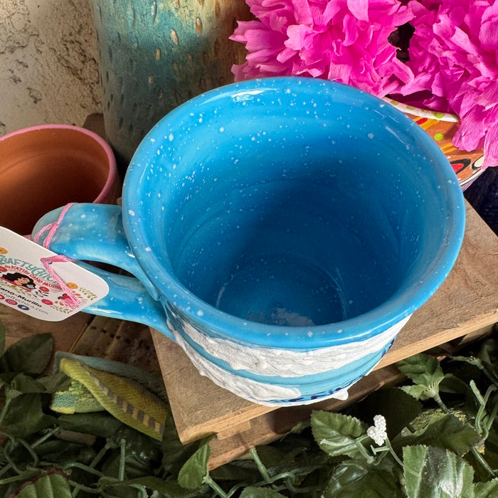 This hand-painted Sueña en Grande mug is a daily invitation to dream bigger, think brighter and believe in what’s possible. Painted in a soft sky-blue glaze with dimensional, hand-sculpted clouds, it feels like holding a little piece of the sky in your hands.