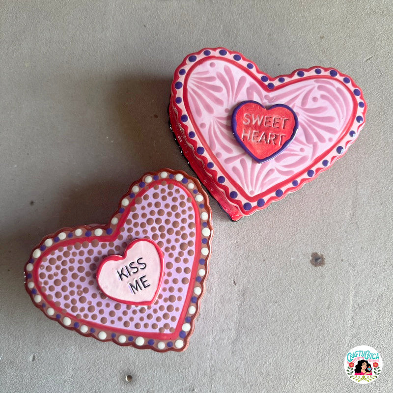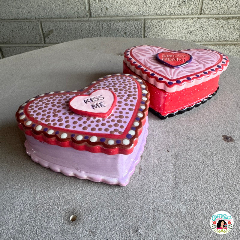 Designed and hand-painted by Kathy Cano-Murillo. Each glazed fired ceramic heart box has a fused ceramic conversation heart on top.