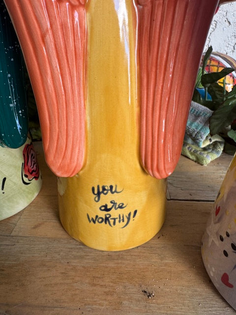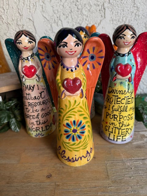 This hand-painted Blessings Amiga Angel is a radiant symbol of gratitude, grace and everyday miracles. With her open heart, vibrant wings and joyful folk-art details, she carries the energy of appreciation for all that is — and all that is still unfolding.