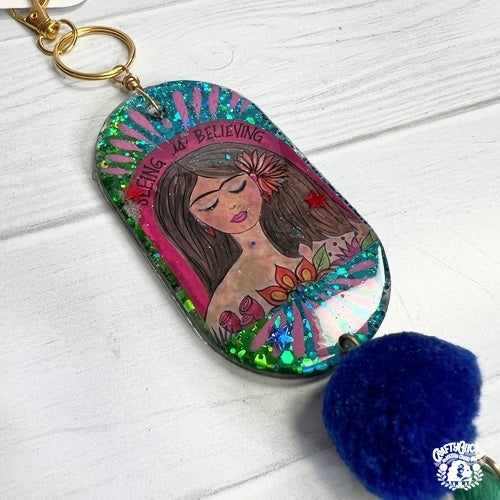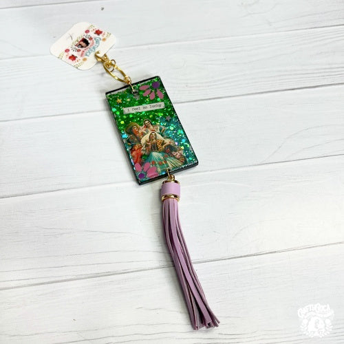 Add a burst of cultura and sparkle to your bag with these one-of-a-kind Chicana bag charms, handmade by Kathy Cano-Murillo in her Phoenix studio. Each charm is crafted from crystal-clear resin and features an embedded vintage or original image, swirled with glitter and sealed with love.