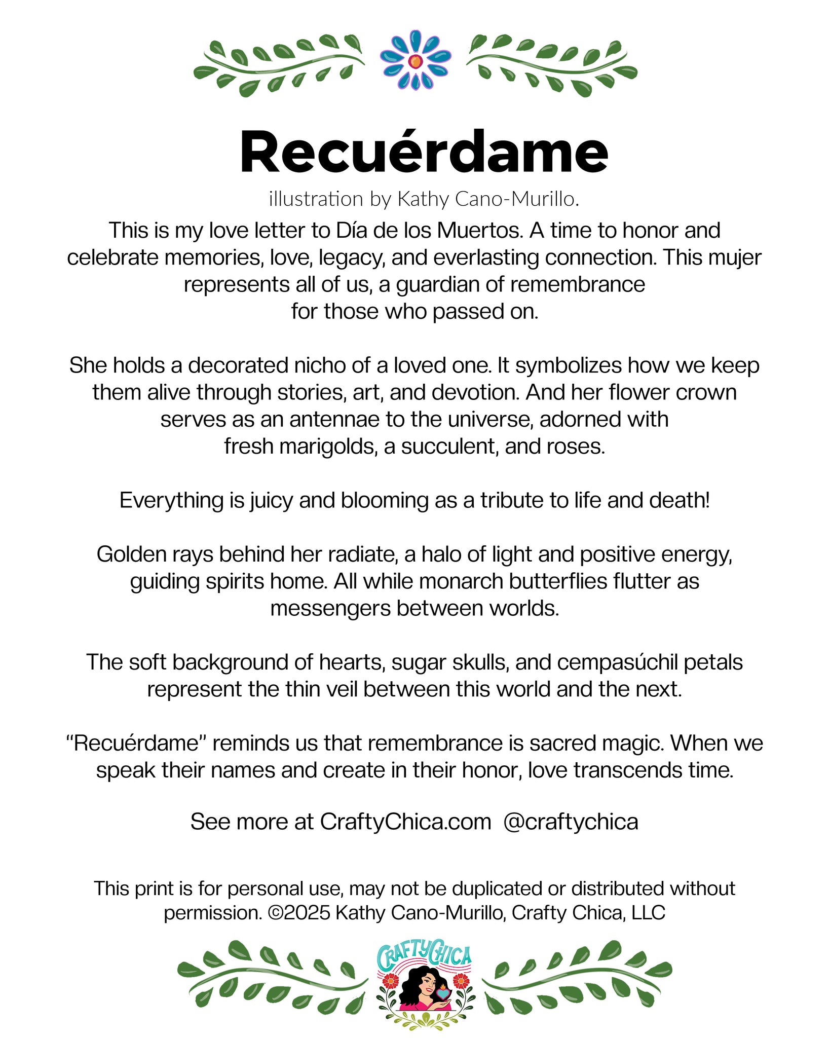 “Recuérdame” reminds us that remembrance is sacred magic. When we speak their names and create in their honor, love transcends time.
