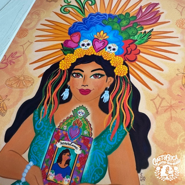 She holds a decorated nicho of a loved one. It symbolizes how we keep them alive through stories, art, and devotion. And her flower crown serves as an antennae to the universe, adorned with