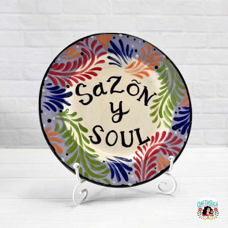Bring flavor, culture, and corazón into your space with this one-of-a-kind, hand-painted plate by Kathy Cano-Murillo featuring the phrase Sazón y Soul.